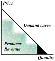 Still, a few dollars is still more than a marginal cost of zero. One may well ask how significant a violation of efficiency is involved when marginal users facing a price that is slightly above marginal cost. This question can be answered using the tool of consumer surplus. Consider Figure 1, which illustrates a demand curve for a good; we assume a marginal cost of production of zero. We imagine a nonlinear pricing scheme which collects different fees from different users; we've also illustrated the revenue collected from the consumers in the diagram.