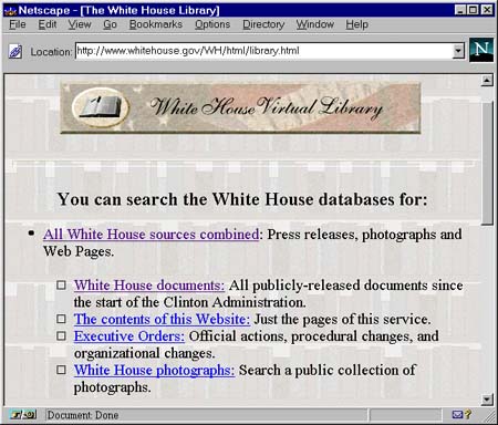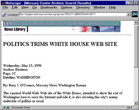 In our interview, Lytel emphasized his pride that the White House site was a governmental repository, not a political one; the White House Web presence is pointed to by the Republican Party, the U.S. House, and tens of thousands of other Web sites as a valuable information resource. Lytel recognized his place in history as the first White House webmaster, and he wanted to establish a tradition that the site would house a substantial collection of serious, more-or-less unbiased information.Unfortunately, the recent experience with the disappearance of the speech archive calls into question the wisdom of having a government agency maintain its own archive of news or historical materials. In this case, we have an Administration that is generally favorably disposed towards electronic dissemination of information: it is said that Clinton has never shied away from a podium -- and this is a sort of virtual podium. Some people credit Vice President Gore with coining the term "information superhighway."