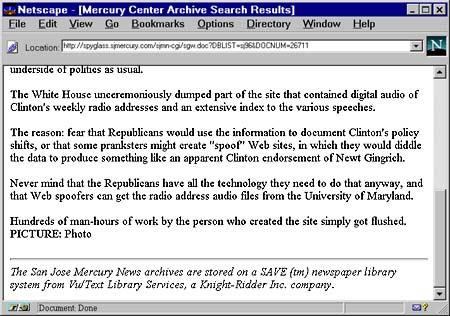 Although it might be tempting to believe that the Saturday radio archive could be used in opposition research, it really wouldn't be useful in that application: existing text transcripts, available via commercial online indexes for years, would provide the starting points. Furthermore, you'd need broadcast-quality audio and video to build a radio or TV ad, and the RealAudio archive, prepared in a format for delivery to dial-up modem users, would not provide adequate audio quality. In fact, several months ago, when Lytel first told me about his plans for building the speech index, I suggested that the service might be exploited by the President's opponents. Back then, Lytel dismissed the idea as ludicrous; he said the political parties have all the databases and technology they need to accomplish the task on their own. What he failed to realize is that some of his colleagues at the White House harbored that very fear.