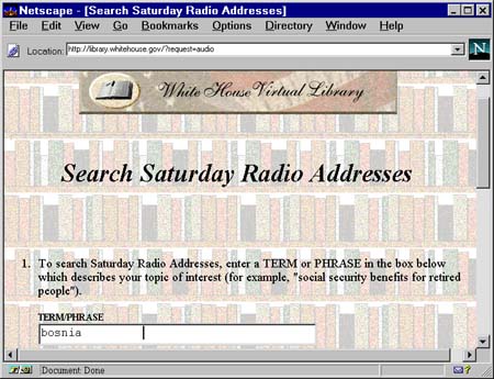 The new service makes extensive use of audio. Not only can citizens search for documents, but they can search the archive of the President's Saturday radio addresses and listen to the section of the speech in which the President talks about what interests them. The new service also includes a database of photos of important events in the Clinton Administration.