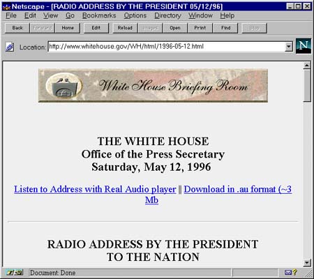 Wrong. We already had this sort of sophisticated archive. David Lytel, until recently the Webmaster of the official White House site, conceived and implemented such a service, using some powerful indexing technology and the RealAudio product. And for some reason, sometime in April 1996, the service disappeared from the White House site on the World Wide Web.