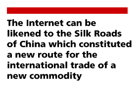 The Internet is commonly thought of as a communication tool, however this is characterization is incomplete. Although the Internet is a tool that enables people to send and receive text, voice, images, and other data, it is also characterized not as a 'more modern communications device', but as a new trade route. The Internet can be likened to the Silk Roads of China (circa 2nd century B.C.) which constituted a brand-new route for the international trade of a "brand new" commodity [ 9 ]. The Silk Roads provided a new link between the East and West for the transport of a brand-new commodity (silk), whereas the Internet provides a link between every country for the transport of a more familiar commodity, information.The growing sophistication of trade, including international trade, was one of the factors which led to the need for the creation of "money" to replace bartering [ 10 ]. Initially coins, made out of internationally valued commodities such as gold, were used. Money, was subsequently expanded from coins to paper as a response to the growing acceptance by merchants and traders of credit notes which were negotiable internationally. The ability to transport large sums of money across borders via a paper note, was a key development in international commerce [ 11 ]. The shift from a valuable substance (gold) to a representation of value (paper) can then be compared to the current development of electronic cash as a modern market response to the growing acceptance of Internet commerce. Electronic cash, then, is what will enable international trade to grow on the Information highway, the new Silk Road.