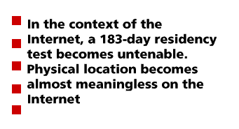 In the context of the Internet, the 183-day test becomes even more untenable. The geographic location of a person has historically been important in affecting where that person is a resident. However, physical location becomes almost meaningless when technology exists that enables individuals to carry out almost every facet of life in another jurisdiction while never actually physically leaving their geographic location even for a single day. A person could effectively make thousands of "trips" per year via the information highway to another jurisdiction without ever being subject to a border control mechanism.