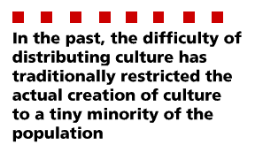 To see from the bottom-up how all this is taking place, let's take a look at the mechanics of culture before the Internet. In the "old days," the relative cost and effort behind creating/distributing something a cultural creation was enormous. To publish a novel, for example, required the editorial skills to select and polish the proper manuscript, the means and expertise to print and bind it, the space to store it, the transportation costs to get it to distributors and bookstores across the country, and the logistical/accounting/ business skills to keep track of what has been shipped, what has been paid for, etc. In fields where the form of the art is significantly more cumbersome than mere text - for example, paintings, sculptures, or symphonies - the process was even more restrictive. In short, the whole enterprise set up a situation where, as they say, "many are called, but few are chosen."