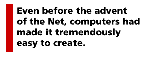 If we accept the foregoing as largely the current situation, we must then ask the question: How can something as new and untested an the Internet change, a dynamic that has been with us since, literally, the dawn of time? Well, let's start with the creation of these works of expression. Even before the advent of the Net, computers had made it tremendously easy to create. For example, word processing programs made it easier for writers to write, revise, store, and retrieve their work, and also provided tools like spell checkers, dictionaries, and thesauri for their easy use. Many artists and design types fell in love with programs like PhotoShop, MacPaint, and Director, which allowed them to carry on their love affairs with shape, texture, and color in a whole new and exciting realm. Then take music: there are many groups for whom a Macintosh computer is their most important instrument; in the playing, recording, and live performance arenas, technical advances have greatly lowered the cost at time of creative musical expression. And the fields of film-making and video have benefited greatly via digital editing, not to mention the amazing special effects that are possible today. And there is every indication that the ingenuity of those creating this hardware and software that so facilitates the creation of culture will continue to ease the task of those who wish to express themselves creatively.