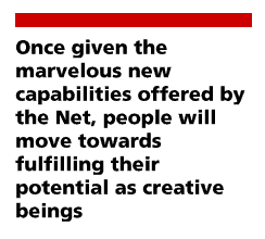 The amazing ability of the Net to hurl text, images, and sound around the globe with tremendous speed, efficiency, and affordability--in combination with a wide range of powerful digital tools--is making it much easier for the average person to create, share, and experience culture.