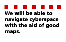 Part of the excitement of the Web flows directly from this paradigm shift in how we view what information is, where it is, and how one piece of information is related to another. In the near future we will see the reality of the Web adhere even more strongly. We will be able to navigate cyberspace with the aid of good maps, maps which tell us where we are and what is nearby. Cyberspace will acquire the textures of real space, with landmarks both personal and official. We will be able to mark our trails like a cyber-Hansel and cyber-Gretel. We will be able to measure distances in any number of useful ways, effectively warping that space to our specification. All this has very interesting implications for progress in achieving greater accuracy in information retrieval.