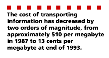 The cost to the NSF for transport of information across the network has decreased by two orders of magnitude, falling from approximately $ 10 per megabyte in 1987 to less then $ 1.00 in 1989 [ 3 ]. At the end of 1993, the cost was 13 cents.
