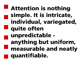Attention is nothing simple. It is intricate, individual, variegated, quite often unpredictable - anything but uniform, measurable and neatly quantifiable. It entails all the senses; it shades off into recognition, memory, appreciation, reflection, love, understanding, empathy, observation, care, attentiveness, waiting, serving and more - all of which are messy and hard to quantify. The attention I am capable of paying is different from yours; the kinds of attention I desire differs from what you want as well. In neither case is it likely that there can be a ranking between us - you more attentive in general, me less, nor vice versa. Nor are we completely equal.