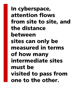 There is an interesting analogy; as we experience cyberspace as space, it is very different from the space of the industrial market system. In the latter, distances are measured in miles or kilometers, and you have no direct access to what goes on far away. In cyberspace, attention flows from site to site, and the distance between sites can only be measured in terms of how many intermediate sites must be visited to pass from one to the other. That in turn depends on how much attention those who maintain each site offer to those who maintain the other sites. The more they offer, the more likely they are to allow a visitor to click on the relevant URL, so the less the separation. Thus the geometry of cyberspace is nothing like the geometry of the prior economy, which offers at least a hint about the respective economic laws as well.