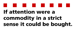 Suppose you go further, taking the ultimate step of paying an entire audience to be attentive to you. In that case, you still have to keep them interested once you have paid. Otherwise they will sit there musing about something else, or perhaps fall asleep. In other words, attention just cannot be reliably bought for any specific price. It is not a commodity.