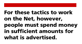 For these tactics to work on the Net, however, people must spend money in sufficient amounts for what is advertised. Consider what would be at stake for First Monday. The kinds of advertisers that in the past supplemented the revenues of comparable printed journals of ideas and scholarship have mostly been publishers of books. It won't be long, presumably, before books too will appear in web versions, so that they too can no longer be sold in the long-accepted way, and thus would also have to depend on advertising.