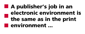 I have long argued that electronic publication differs very little from paper publication. In January, 1992, at a Meckler conference that was later to be renamed Internet World, I spoke on electronic publishing. "A publisher's job in an electronic environment is the same as in the print environment," I said. It includes: choosing material, making it functional, making it attractive, delivering it, and promoting it.