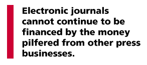 Like real Broadway shows, real (that is, paper) scholarly journals are businesses, designed to meet a market need and make money (or at least cover costs) for their publishers. Real journals start with research to assess the competition and the potential market; a business plan that includes a realistic look at income and expenses projected out five years (the time it takes for a journal to become economically viable); selection of an editorial board that includes luminaries in the field who are committed to research, publishing, and peer review; a careful search for an editor whose name recognition, based on respected scholarship, draws equally illustrious contributors; a possible affiliation with a scholarly society; dignified advertising for the journal in scholarly and library publications as well as (in some cases) a search for dignified advertisers for the journal itself; some pre-publication mailings to gauge the subscription interest; professional staff to handle everything from negotiations with the printer to copy editing to distribution; and on and on. Those of you who have done it know what is involved.