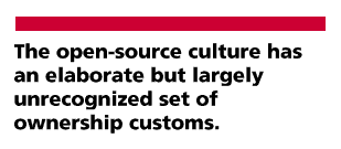 In fact (and in contradiction to the anyone-can-hack-anything consensus theory) the open-source culture has an elaborate but largely unrecognized set of ownership customs. These customs regulate who can modify software, the circ umstances under which it can be modified, and (especially) who has the right to redistribute modified versions back to the community.