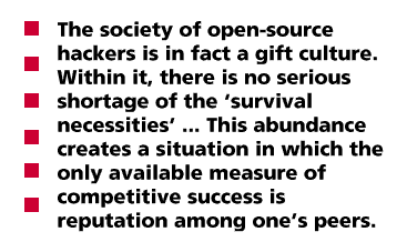 Examined in this way, it is quite clear that the society of open-source hackers is in fact a gift culture. Within it, there is no serious shortage of the 'survival necessities' - disk space, network bandwidth, computing power. Software is freely shared. This abundance creates a situation in which the only available measure of competitive success is reputation among one's peers.