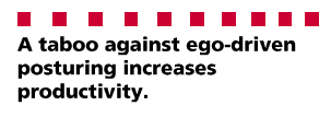 A taboo against ego-driven posturing therefore increases productivity. But that's a second-order effect; what is being directly protected here is the quality of the information in the community's peer-evaluation system. That is, boasting or self-importance is suppressed because it behaves like noise tending to corrupt the vital signals from experiments in creative and cooperative behavior.