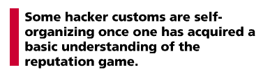 On the other hand, some hacker customs are self-organizing once one has acquired a basic (perhaps unconscious) understanding of the reputation game. Most hackers never have to be taught the three taboos I listed under the section "Promiscuous Theory, Puritan Practice", or at least would claim if asked that they are self-evident rather than transmitted. This phenomenon invites closer analysis - and perhaps we can find its explanation in the process by which hackers acquire knowledge about the culture.