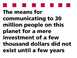 Seen another way, the means for communicating to 30 million people on this planet for a mere investment of a few thousand dollars did not exist until a few years ago. At 28.8bps, dispatching bulk e-mail takes considerable time, and one has to allow for the many addresses no longer valid. Still, improvements in hardware and broadening of bandwidth increase, if anything, the relative advantage of the spammer.