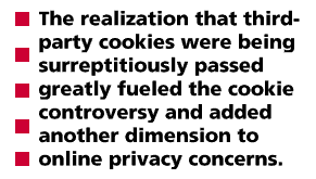 These early concerns or warnings about cookies were mainly inspired by the thought of webmasters misusing cookies in order to glean sensitive data from site users. However, it was eventually observed that some advertising businesses were taking advantage of cookie technology: Users began to notice cookies passed to them by sites other than the ones that they had visited. The realization that third-party cookies were being surreptitiously passed greatly fueled the cookie controversy and added another dimension to online privacy concerns. For example, several comments appeared in The Risks Digest (Forum on Risks to the Public in Computers and Related Systems). Howard Goldstein decries (June 1996) the secretive marketing cookies from companies such as DoubleClick. Several months later, Matin Minow adds (November 1996): "It seems that the very lack of 'real world' controls over online activity which many Internet users favour has created the environment in which marketing companies can thrive" [ 18 ]. Growing concern with cookies have engendered more than these simple postings about the use of third-party cookies, however. Perhaps the most cogent argument against the current manner of using cookie technology can be found in Viktor Mayer-Schönberger's paper "The Internet and Privacy." Mayer-Schönberger studies U. S. and international law and how it applies to the Internet. In his paper, he concludes about cookies: "Existing regulations, targeted at protecting personal information, limit the use and application of cookies. Current cookie usage violates such norms" [ 19 ].