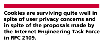 Many individuals have taken a neutral stance toward cookies and have posted pages giving background information and numerous links to other informative sites. Glenn Fleishman attempts to dispel the "furor" over cookies with a careful explanation of their origin, their uses, and their potential [ 20 ]. He also links to several sites of resources. Andy Kington's Netscape Cookie Notes [ 21 ], like the Fleishman site, offers information on both the uses of cookies and the security questions that have arisen. As does Fleishman, this site encourages further study by providing advice and links to useful resources. David Forrester, in "Cookies in the Middle: A Burning Issue" [ 22 ], is especially careful in explaining just what a cookie can do; he spends a good amount of space addressing the issue of personalized ads that are used by marketers - which is, of course, the issue about cookies that privacy activists most often debate. Such a use (or abuse) of cookies by marketers damages the chances that cookies will be generally acceptable in their less intrusive forms (i.e., shopping carts). Forrester gives the options that are being developed, however, such as the Electronic Frontier Foundation (EFF) and CommerceNet proposal for guidelines. As a result, he sees future guidelines allowing both sides to be happy: "Marketers will have more information on their sites and their visitors ... and users will benefit from useful applications of HTTP cookies like shopping carts and personalization."