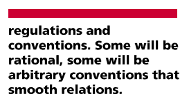 It seems likely that the Internet will, in time, accumulate a long list of regulations and conventions. Some will be rational, some will be arbitrary conventions that smooth relations. The framework that our children grow up to use will be incomprehensible to us, even unjustifiable to us, but that framework will be the glue holding the global community together.