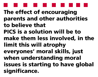 The obvious use of PICS is to help a child who needs moral safeguards in their selection of material. It is not clear to me that a computer can do this in principle. The effect of encouraging parents and other authorities to believe that PICS is a solution will be to make them less involved, in the limit this will atrophy everyones' moral skills, just when understanding moral issues is starting to have global significance.