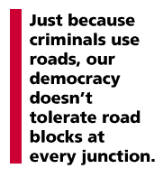 Just because criminals use roads, our democracy doesn't tolerate road blocks at every junction. We tolerate road blocks used judiciously and to catch specific criminals; the idea that everyone is a potential crook is abhorrent [5]. That reasoning applies to the Internet: it is abhorrent to set up censors everywhere regardless of how easy computers make it seem to do so.