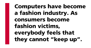 The result is that computers have become a fashion industry. As consumers become fashion victims, everybody feels that they cannot "keep up" - the fashion markets are always providing enough temptations to keep most people ahead of us, which in turn pressurises us to catch up to remain in touch.