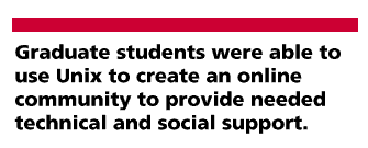 By developing Usenet, the Unix community became the force behind the creation of an online community to welcome participants into the cooperative culture so important in creating Unix. Graduate students at Duke and the University of North Carolina were able to use Unix to create an online community to provide needed technical and social support. They named this users network Usenet.