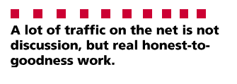 I am told that a lot of traffic on the net is not discussion, but real honest-to-goodness work. (Code, applications, ideas, and such.) [29].