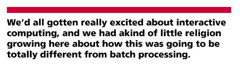 Well, it turned out that these guys at MIT and BBN...We'd all gotten really excited about interactive computing, and we had a kind of little religion growing here about how this was going to be totally different from batch processing [23].It was during this period that Licklider carried out an experiment to try to determine how the computer could aid him in his intellectual work. He explains:
