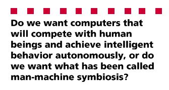 The pioneers also observed that there were opposing visions of what the future should be. One road was that of human-computer symbiosis, of a close interaction between the human and the computer so each could function more effectively. "The hope is that, in not too many years," J. C. R. Licklider wrote, "human brains and computing machines will be coupled together very tightly, and that the resulting partnership will think as no human brain has ever thought and process data in a way not approached by the information- handling machines we know today" [62]. The other road was that of creating computers that would be able to do the thinking or problem solving without human assistance. Pioneers such as Licklider explained that "man-computer symbiosis is probably not the ultimate paradigm for complex technological systems" and that at some point in the future "electronic or chemical 'machines' will outdo the human brain in most of the functions we now consider exclusively within its province." He maintained, however, that, "there will nevertheless be a fairly long interim during which the main intellectual advances will be made by men and computers working together in intimate association" [63]. Though Licklider was willing to concede "dominance in the distant future to celebration of machines alone," he recognized the creative and important developments that the partnership between the human and computer would make possible. He predicted that the years of human-computer symbiosis, "should be intellectually the most creative and exciting in the history of mankind" [64].