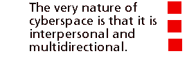 "Who will have access to this cornucopia of information, and on what terms? Will fiber-optic superhighways make stored knowledge universally available, in the tradition of the public library, or will they merely facilitate psychological carpet bombing designed to soften up consumer defenses? And what of the network news? Will it be superseded by local broadcasts, with their heartwarming (always "heartwarming") tales of rescued puppies and shocking (always "shocking") stories of senseless mayhem, mortared together with airhead banter? Or will the Big Three give way to innumerable news channels, each a conduit for information about global, national and local events germane to a specific demographic? Will cyberpunk telejournalists equipped with Hi-8 video cameras, digital scanners, and PC-based editing facilities hack their way into legitimate broadcasts? Or will they, in a medium of almost infinite bandwidth and channels beyond count, simply be given their own airtime? In short, will the electronic frontier be wormholed with "temporary autonomous zones"---Hakim Bey's term for pirate utopias, centrifuges in which social gravity is artificially suspended---or will it be subdivided and overdeveloped by what cultural critic Andrew Ross calls "the military-industrial-media complex?"The answer lies in the nature of the Internet. Everybody will have access to information. The very nature of cyberspace is that it is interpersonal and multidirectional. There is no control and - despite the best efforts of the censors - there is no overseer. We see for the first time the elements of mainstream media on the retreat, trying to legislate, trying to litigate, trying to appropriate. But as the nature of cyberspace is communication such efforts will be in vain, for communication is deeply personal, exactly the opposite of the mass media message. We see this through concrete examples of anti-meme activities on the Net.