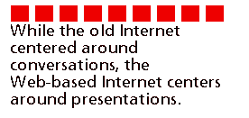 Then came the invention of the Web. Originally conceived as a better way to enable scientists to distribute their research, it evolved beyond the scientific community and became the most popular part of the Internet. Indeed, most people today define the Internet as the Web and e-mail. While the old Internet centered around conversations, the Web-based Internet centers around presentations. By "presentations" we mean a published book, a dramatic or musical performance, a television program, an advertisement, and the like. A presentation is based on a script, can be repeated without losing its essential qualities and - most important - is intended for an audience. While there are brilliant conversationalists, conversations are essentially egalitarian. Presentations deploy some of the same skills used in conversation, but they call for additional aptitudes and abilities. Unlike good conversations, good presentations require special talents and demand expertise. They are fundamentally not egalitarian.