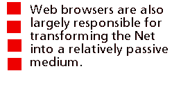 Despite all the hype about interactivity, Web browsers are also largely responsible for transforming the Net into a relatively passive medium, considerably less active than claimed by those who celebrate the Web as a spectacular breakthrough in interactivity. Users need only point and click their mice, much like the proverbial couch potatoes point and click their television remotes.