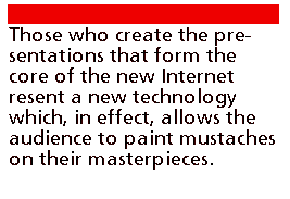 Today there is a debate between Internet advertisers about how Net surfers experience the Web [ 8]. One group argues that they are "passive," and the Web experience is really a variant of television viewing. The other contends that they are "active." This group insists that they don't watch the Net, rather they use it. While the debate has implications for advertising and the structuring of commercial Web sites, whichever side is right - and there is no reason to believe that only one side must be right - the Web experience for the overwhelming majority of users is not genuinely interactive, nor do they want it to be. Even those who are active users of the Net basically want to get what Web sites have to offer, and we doubt that they will spend their valuable time sifting through irrelevant and silly postings. Of course some will, but for Third Voice to make a significant impact on the Internet rather than become a minor niche product, millions of people would have to find the experience of reading such postings useful. We would be surprised if this happened. The future of the Internet does not lie in recovering its more egalitarian and participatory past. It has become a mass medium and as such major content providers will dominate it.