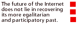 Third Voice has been greeted with great enthusiasm by many commentators because it seems to herald a rebirth of the old spirit of the Net. Enthusiasts once believed that access to cyberspace would usher in a new era of equality and participatory democracy. As the first truly interactive mass medium, the Net had the ability to free people from being largely passive consumers of information doled out by the established mass media. Everyone could become both a reader and a publisher, a viewer and a broadcaster. Before the explosion of users attracted by the World Wide Web and the graphical interface of the Web browser, the Internet was a text-based medium that facilitated communication through electronic mail, bulletin boards, newsgroups, and listservs. It also provided other useful functions such as remote logins and FTP downloads as well as proprietary services, available from CompuServe, Prodigy and America Online. Being online became exciting for Internet enthusiasts as forums and conferences developed through these channels.