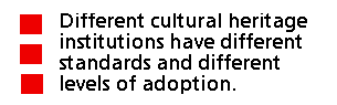 As we examined the 15 existing digitization projects ( http://coloradodigital.coalliance.org/browse.html) that were underway in the fall of 1998, we found that different cultural heritage institutions have different standards and different levels of adoption. Libraries have a long tradition of standards that are broadly adopted by all types of libraries for a wide range of materials. Archives have a tradition of standards in the areas of preservation and conservation and best practices for finding aids. Within the museum community, specific segments have standards, such as art museums, however across the museum community there are few commonly adopted standards. Additionally museums and historical societies are faced with a wide range of non-textual, three-dimensional objects that provide additional difficulties in description and scanning. Historical societies frequently have a library, archives, and museum. Within each area, they are likely to use the standards for that function.