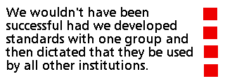 More importantly, we realized that we could learn much from the representatives from the different institution types. The library cataloger's understanding of the descriptive and analytical needs of three-dimensional objects was expanded. The approaches museums and historical societies take to describing their collections was new to many and had to be accommodated in the metadata. Similarly scanning needs of the different institutions had to be considered. For example the requirements for a digital image of a painting held by an art museum, which would be used for scholarly research or commercial publishing, required a different set of standards and skills than scanning photographs from a library collection for general user access.