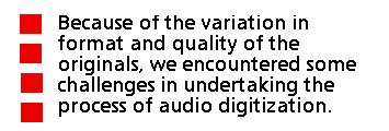 Because of the variation in format and quality of the originals, we encountered some challenges in undertaking the process of audio digitization. One issue always at the forefront has been whether and to what extent we should "clean up" the originals for more audible listening. Being an archive, the first concern of the ATM is to preserve the original recording as much as possible in the archival tape copy. On the other hand, the access copies (CD and digital file) produced are intended for public use. The original recordings range from professionally recorded broadcast material to amateur home recordings of personal letters. Volume level often varies tremendously in the amateur recordings. Rather than continually adjust the recording level during the digitization process, we tried to find an appropriate level for each recording to balance the highs and lows. In some cases, however, the volume was raised at certain points to aid in audibility. Equalization in old 78 commercial and acetate recordings has also been a difficult issue, because altering the volumes of various frequencies in the original could risk the loss of valuable information in the "noisy" original. Finally, one of the most time-consuming aspects of digitizing the audio has been recording track or index times and descriptions to aid users' access to the recordings and allow users to locate particular songs or segments without having to constantly fast forward, rewind, etc. The level of documentation was very inconsistent from item to item, so a great deal of research was necessary in some cases to determine the true contents of a recording.