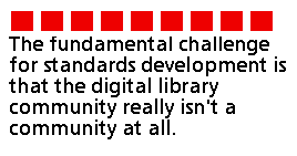 I'd like to assert that the fundamental challenge for standards development is that the digital library community really isn't a community at all. When we speak of the "library community", this is not just a handy phrase; there is an actual communal infrastructure and commonality of interest. I certainly wouldn't go so far as to say that all librarians know all other librarians, but I would venture that most of us know the librarians active in our own areas of interest, regardless of where they are located geographically, and if we don't know them personally, we know where to find their names. We have frequent and regular meetings of regional, national, and international professional associations and membership organizations, and we have committees and mailing lists and interest groups at the national and international levels. In fact, we have so many opportunities and mechanisms for cooperation and communication that it's often hard to get our work done at our home institutions.