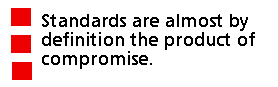 Possibly the worst reason is the "not invented here" syndrome that I'm sure you've all encountered in one form or another. As an ex-programmer I can safely say that it is much more fun to design and develop an application from scratch than it is to follow someone else's specification. But there is some legitimacy to this as well. Standards are almost by definition the product of compromise, and they tend to reflect this. It is extremely unlikely that a standards-based solution, whether it be a protocol or data dictionary or procedure or format, can be as efficient and effective for any particular application as a solution tailored to that application. You nearly always give something up when you adopt a standard.