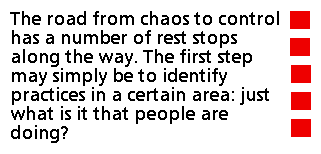 There is also, I think, a practical move to adopt the most "lightweight" standardization that will serve the purpose. It is very important to recognize that the road from chaos to control has a number of rest stops along the way. The first step may simply be to identify practices in a certain area: just what is it that people are doing? For example, the RLG-DLF Task Force on Policy and Practice for Long-term Retention of Digital Materials took it as their first task to gather institutional digital archiving policies and documentation of current digital archiving practices [ 4].