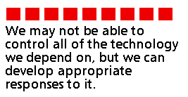 The last challenge I'll mention is the simple fact that many of the technologies we depend on are quite literally out of our control. If we are working with digital libraries, we're working with the Internet, the Web, multimedia, document imaging, and any number of technologies that serve far larger, richer, and more powerful constituencies than ourselves. We can agree upon the features we wish we had in our Web browser, but we shouldn't expect to see them in the next version of Internet Explorer. Nor should we expect to make much of an impact on the development of technologies for authentication, e-commerce, rights management, or other areas where large commercial interests are involved.