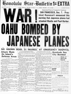 Figure 2: Page One of the Honolulu Star-Bulletin from the Hawaii War Records Depository.HWRD holds approximately 1,000 newspaper photographs clearly identified as being from the Honolulu Star Bulletin and 325 photographs clearly identified as being from the Honolulu Advertiser, representing primary material from the two English-language Honolulu newspapers. Because the newspapers have lost most of their old photographs, these prints frequently are the only copies extant from the time of the War. In this project, we will create descriptions for the photographs scanned and provide the capacity for patrons to search descriptions using personal names, corporate or organizational names, subjects, or dates. The Honolulu Star Bulletin and Honolulu Advertiser have given permission to post digital images of photographs created by the photographic staff of the Star Bulletin and the Advertiser. A copyright statement appears on each photo, and the investigation of the use of watermarking technology is underway.
