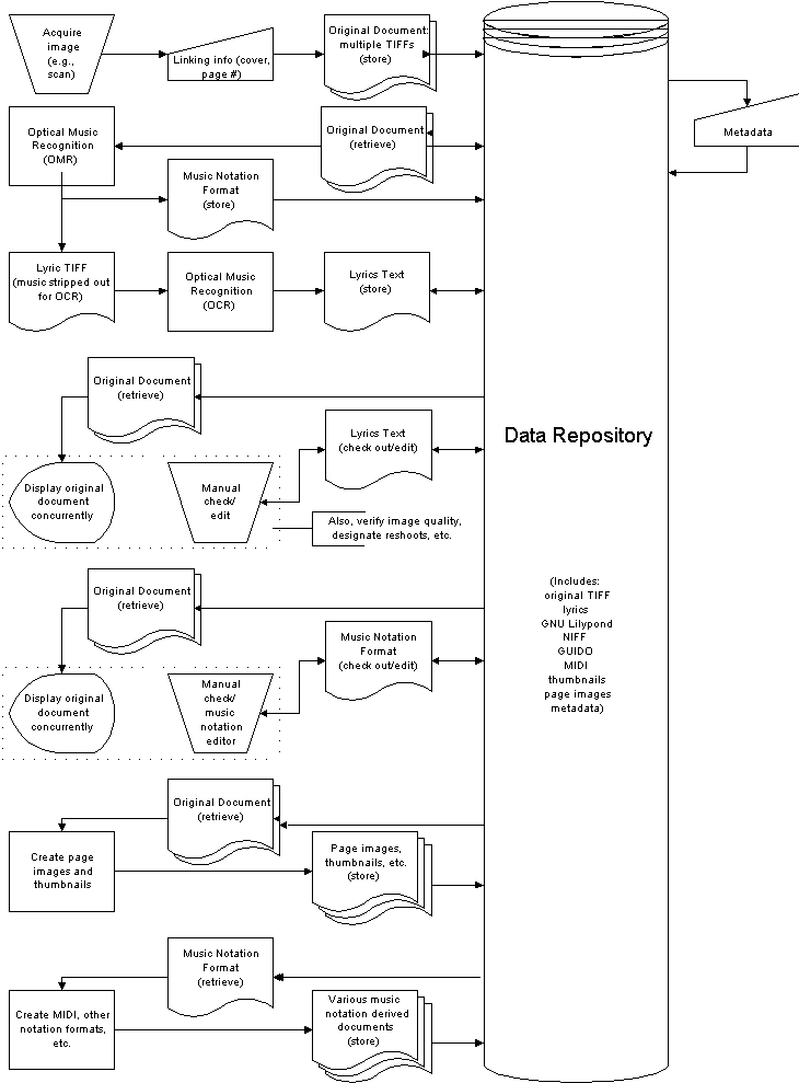 Figure 1: Schematic of Workflow Management System (WMS)A comparison of project workflow with and without WMS may prove illustrative. Recall that the proposed OMR software will produce TIFF images of full-text lyrics and either NIFF or GUIDO derivative files. Without the WMS, both sets of files would have to be inspected, edited, marked up, and verified manually using disconnected software tools (which often leads to transferring large files between systems). Ideally, an individual well-versed in music would edit the NIFF or GUIDO files, but these students may not be experts with the specific software used for file processing. This combination of conditions introduces the vast amounts of time and effort for the workflow process. The WMS will provide a comprehensive and integrated set of automatic (e.g., checking for minimum set of administrative metadata), semi-automatic (e.g., creating thumbnails) and manual tools for examining objects in a data repository. That is, individuals can eliminate certain activities (provided through the WMS) and perform various tasks at one workstation. By including connections to other software tools, if an individual feels comfortable using a particular application (e.g., Adobe Photoshop), the WMS can exploit the particular skills of this individual.