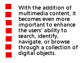 With the addition of multimedia content, it becomes even more important to enhance the users' ability to search, identify, navigate, or browse through a collection of digital objects. The users' must be able to navigate between the image, text, and sound components of individual sheet music items.