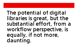 The enhancements from Phase Two of the Levy Project will result in a digital library of thousands of objects in a variety of media formats that can be used for research, teaching, or even for casual use. Appropriate metadata and toolkits will offer seamless and detailed examination of the digital library. As mentioned previously, the potential of digital libraries is great, but the substantial effort, from a workflow perspective, is equally, if not more, daunting.