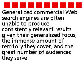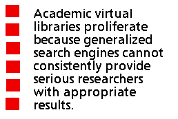 There is a major need for expert mediated virtual libraries (VLs) of well-selected and described links to scholarly and educational resources. VLs are one important component in providing for the Internet resource-finding needs of the academic community. Generalized commercial Web search engines, and even second generation engines such as Google, are often unable to produce consistently relevant results given their generalized focus, the immense amount of territory they cover, and the great number of audiences they serve (Chakrabarti et al., 1999a and 1999b; McCallum et al., 2000). Other problems here include a lack of intelligible descriptive information contained in results displays, unobjective representation of search results (since site placement can be purchased), distracting messages and advertisements, and the possibility in the future of becoming fee-based at costs that academia might not be able to bear.